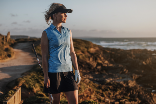 The contemporary MEG design and super stretchy MAYLA seersucker fabric shirt are two other top sleeveless styles for the hottest of days on the golf course, while the bold MELODY and two-tone MIRELLE short-sleeve shirts can be worn both on and off the fairways.